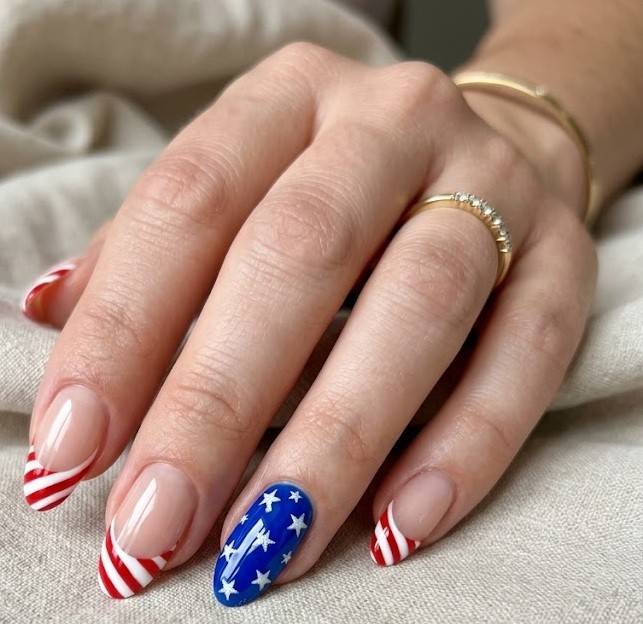 This design gives the classic French manicure a patriotic makeover. Instead of traditional white tips, the nails feature red and white stripes or bold blue tips with star accents. A nude or sheer base keeps the overall look clean and balanced. The design is both trendy and timeless, making it suitable for various occasions.