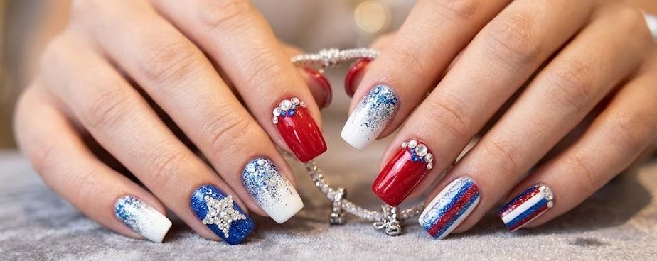 Glitter nails are a go-to choice for adding sparkle and excitement to your Memorial Day look. This design uses shimmering red, blue, and silver glitter to create a festive and eye-catching manicure. You can go for full glitter coverage or use it as an accent over a solid base.