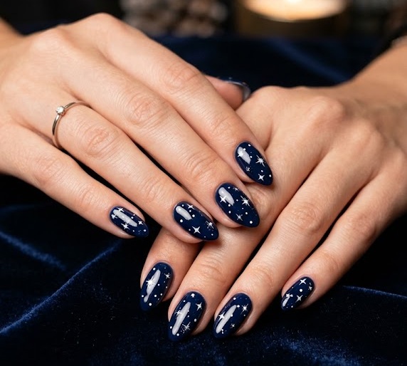 Inspired by the night sky, this design uses a deep navy or midnight blue base with scattered white stars. The stars can vary in size to create a more natural, celestial effect. A glossy or slightly glittery finish adds depth and dimension. This style is subtle yet meaningful, reflecting the “star-spangled” theme in a unique way. It works especially well on shorter nails for a clean appearance.