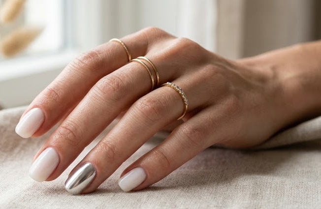 Milky chrome accent nails mix minimalism with a hint of shine. Most nails keep the soft milky base, while one or two nails feature a subtle chrome powder or metallic finish.