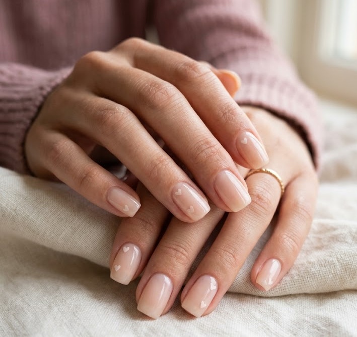 For a romantic twist, tiny heart accents can be added to a milky base. The hearts are usually small and delicate, often placed near the cuticle or center of the nail. This design keeps the manicure sweet and minimal.