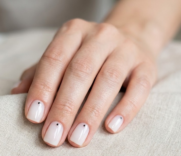 If you want subtle nail art while keeping the natural aesthetic, tiny dot accents are perfect. A milky sheer base is paired with delicate dots near the cuticle or center of the nail.