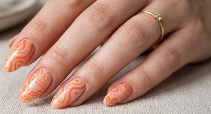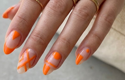 Abstract orange nails are all about creativity and individuality. This design features swirls, curves, dots, or geometric shapes using orange tones on a nude or transparent base. It gives a modern and artistic feel, perfect for trendsetters. Each nail can have a unique pattern, making the manicure look like a mini art gallery on your fingertips.