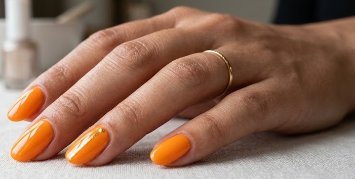 A classic glossy orange manicure is timeless and effortlessly stylish. This design features a single vibrant orange shade applied evenly across all nails, creating a clean and polished look. It’s perfect for those who love bold colors without intricate patterns. The glossy finish enhances shine and makes the color pop, especially under sunlight. Whether you choose a bright tangerine or a softer coral tone, this style works for both everyday wear and special occasions.