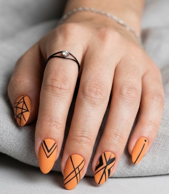 This bold design pairs matte orange nails with sleek black accents for a striking contrast. Think thin lines, geometric shapes, or minimalist patterns drawn over a matte orange base. The combination creates a modern, edgy look that feels both stylish and powerful. It’s perfect for those who love a bit of drama in their manicure while keeping it clean and structured.