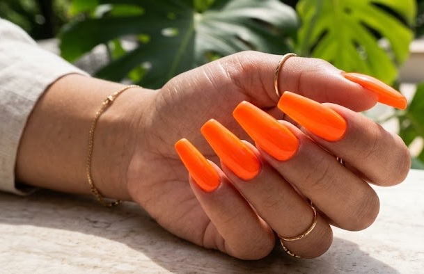 Neon orange nails are bold, energetic, and impossible to ignore. This design uses high-intensity fluorescent shades that instantly grab attention. Perfect for summer parties or beach vacations, neon nails give off a fun and youthful vibe. You can go for a matte finish for a trendy edge or glossy for extra brightness. This style is ideal if you love making a statement with your nails.