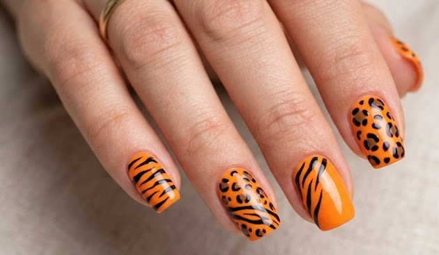 Animal print nails in orange tones are fierce and fashionable. Leopard spots or tiger stripes over an orange base create a wild, bold aesthetic. You can mix patterns across nails or keep one accent nail for a balanced look. This design is perfect for making a statement and adds a playful yet edgy twist to your manicure.