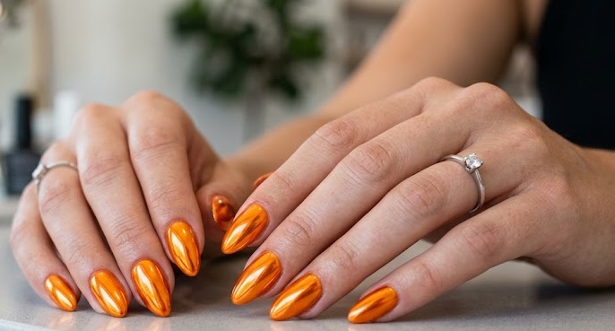 Orange chrome nails offer a futuristic, mirror-like finish that instantly elevates your look. The metallic shine reflects light beautifully, creating a smooth and polished appearance. This design is perfect for trendsetters who love bold and high-fashion styles. Whether done in bright orange or a deeper copper tone, chrome nails give a sleek and modern vibe that stands out in any setting.