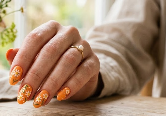 Orange floral nails combine brightness with soft, feminine details. Typically, a vibrant orange base is decorated with delicate white or pastel flowers, creating a cheerful and playful look. This design is inspired by retro “flower power” styles and works beautifully in spring and summer. Adding tiny green leaves or dots can enhance the overall aesthetic and give it a fresh, garden-inspired feel.