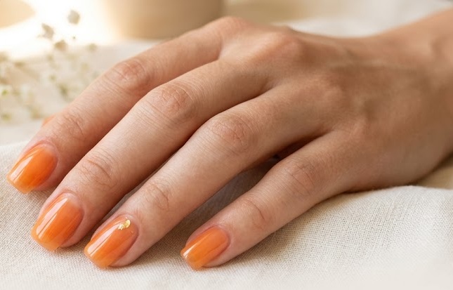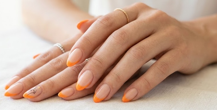 Negative space nails use clear or nude sections combined with orange designs to create a modern, minimalist look. Patterns like stripes, half-moons, or geometric shapes leave parts of the nail bare, adding an artistic and trendy touch. This design feels fresh, clean and fashion forward, perfect for those who love subtle creativity.