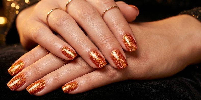 If you love sparkle, orange glitter nails are the perfect choice. This design incorporates shimmering glitter or metallic flakes over an orange base, creating a dazzling effect. You can go full glitter or add it as an accent nail for a balanced look. The shine catches light beautifully making it perfect for parties, weddings, or festive occasions.