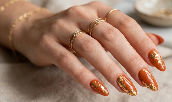 Orange and gold nails create a luxurious and elegant combination. The warm orange tones pair beautifully with metallic gold accents like foil, glitter, or stripes. This design gives a rich, regal feel and is perfect for festive occasions or weddings. The contrast between matte or glossy orange and shiny gold adds depth and sophistication.