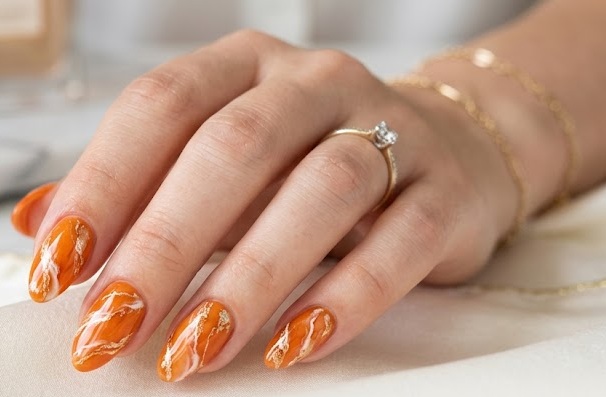 Orange marble nails bring a luxurious, artistic touch to your manicure. This design mimics the natural stone effect by blending orange with white, nude, or gold veins to create a fluid, swirling pattern. Each nail looks unique, making it feel like wearable art. The glossy finish enhances the marble effect and gives a high-end salon vibe. This design works beautifully for formal events or when you want something sophisticated yet eye-catching.