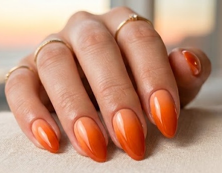 Orange ombre nails create a stunning gradient effect that blends multiple shades seamlessly. This design often transitions from soft peach to deep orange or even mixes yellow and coral for a sunset-inspired look. The smooth color fade adds depth and dimension making your nails look artistic yet elegant. Ombre nails are perfect for summer vacations or festive occasions when you want a soft but eye-catching manicure.