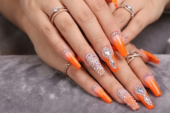 For a glamorous touch, orange rhinestone nails add sparkle and elegance. Small crystals or gems are placed strategically on one or more nails to create a dazzling effect. Whether you go for subtle accents or full-on bling, this design is perfect for weddings, parties, or festive occasions. The contrast between bright orange and shimmering stones makes your nails stand out beautifully.