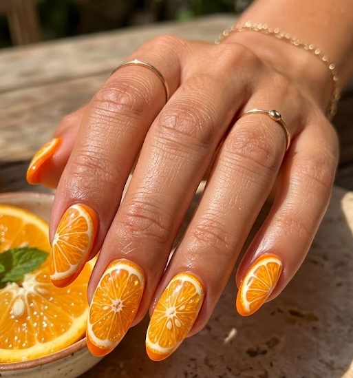 Orange slice nails are fun, playful, and perfect for summer. This design features tiny citrus slice patterns painted on the nails, often with a glossy finish to mimic juicy fruit. It’s a creative way to embrace the orange theme while adding a unique twist. This style is ideal for vacations, beach outings, or just brightening your mood.
