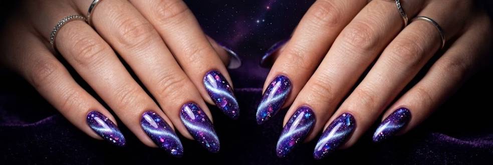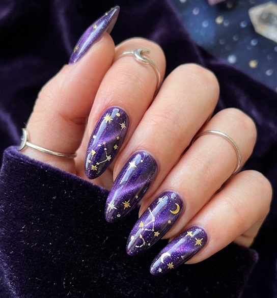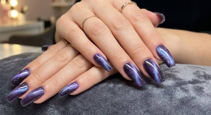 This design brings the beauty of the universe right to your fingertips with a deep, space-inspired purple base. The magnetic cat eye effect creates a glowing streak that resembles a shooting star across a night sky. Tiny flecks of shimmer mimic distant galaxies, adding depth and intrigue. When viewed under different lighting, the nails shift and sparkle like a real cosmic scene.