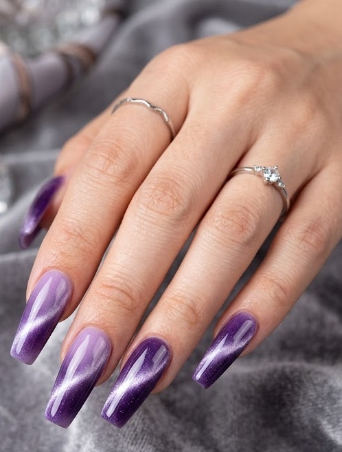 Dual-tone designs combine two contrasting purple shades in one nail. The cat eye effect runs across both tones, blending them visually. This creates a striking contrast while maintaining harmony. It’s a bold yet balanced look that stands out effortlessly. Coffin or square nails work best for this design. The glossy finish enhances the color contrast. It’s perfect for those who enjoy creative and unique nail styles. This design adds depth and personality to your manicure.