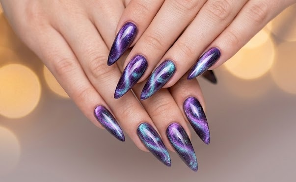 From soft lavender glows to deep cosmic plums, purple enhances this effect beautifully, making it one of the most popular choices for statement manicures in 2026.