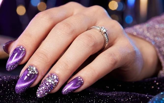 This glamorous design takes purple cat eye nails to the next level with added sparkle. Glitter or rhinestones are strategically placed to highlight the magnetic effect. The combination creates a dazzling, multidimensional look that catches light from every angle.