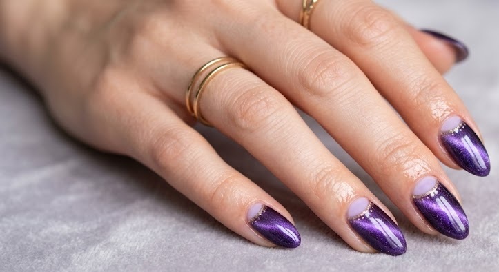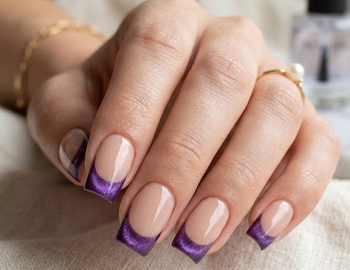 This modern French manicure elevates a classic look with a touch of purple shimmer. The base remains nude or sheer, keeping the design clean and sophisticated. The tips are coated in purple cat eye polish, creating a glowing magnetic edge.