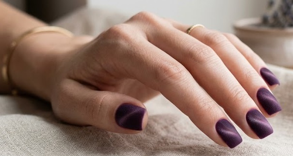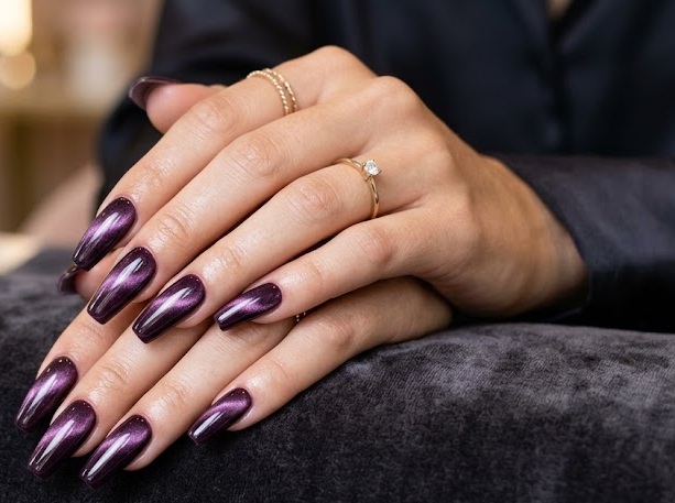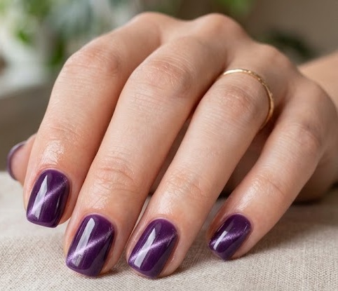 Velvet plum cat eye nails deliver a rich, luxurious look with deep purple tones. The magnetic effect creates a soft, glowing band that resembles velvet fabric under light. This texture-like finish makes the nails appear plush and sophisticated. The darker shade adds drama, making it ideal for fall and winter seasons. Coffin or almond shapes enhance the elegance of this design.