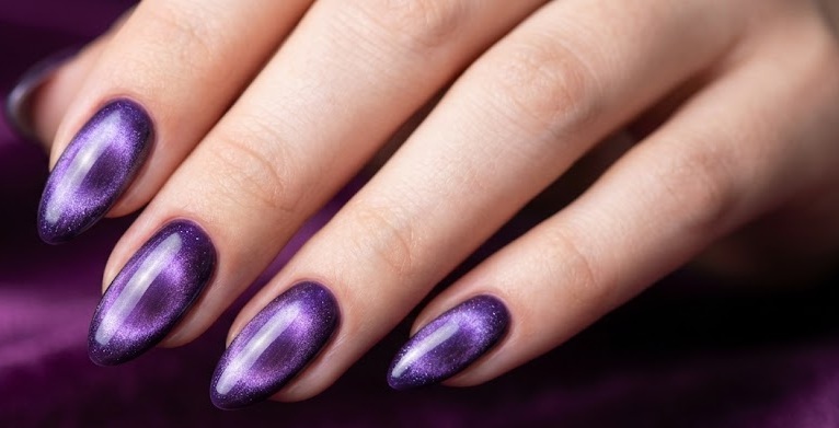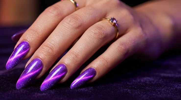 Purple cat eye nails are one of the most mesmerizing nail trends right now, combining magnetic shimmer with rich violet tones to create a glowing, dimensional effect. This style uses special magnetic pigments to form a reflective “cat eye” line that shifts with light, giving nails a luxurious, almost 3D appearance.