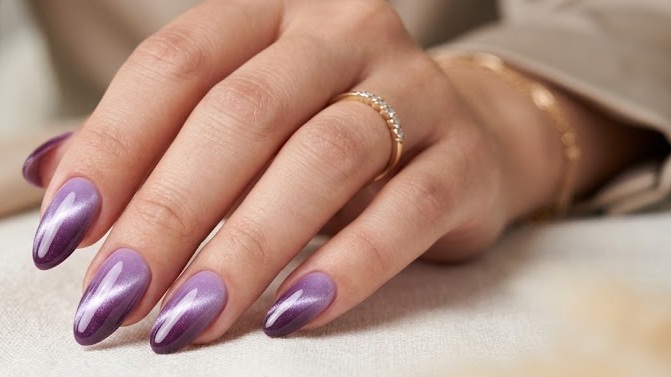 Lavender glow cat eye nails offer a soft, dreamy interpretation of the magnetic trend. The pastel purple shade gives a light and airy feel, perfect for spring and everyday wear. The cat eye shimmer is subtle, often placed diagonally to create a gentle glow rather than a bold line.