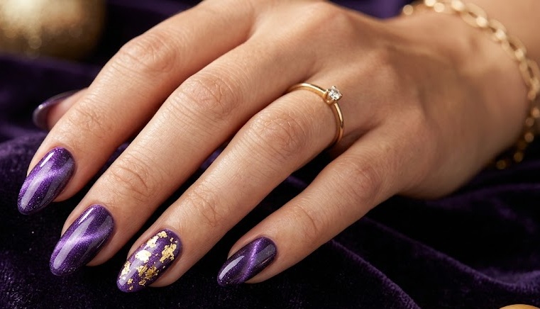 Adding foil accents gives purple cat eye nails a luxurious upgrade. Gold or silver foil pieces create a textured, metallic contrast. The shimmer base enhances the reflective quality of the foil. This combination looks rich and high end. It’s perfect for festive or formal occasions. Almond or coffin shapes work best. The design feels artistic and elegant. It’s ideal for those who love detailed nail art.