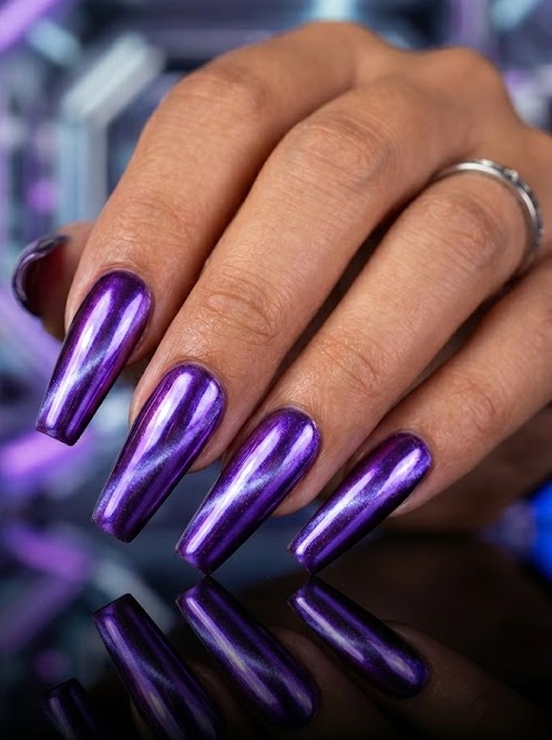 Purple chrome cat eye nails combine two trending finishes into one striking manicure. The chrome base gives a mirror-like reflection, while the magnetic pigment creates a glowing line that shifts with movement. This layered effect results in a futuristic and high-fashion appearance. The nails look almost liquid-like under light, making them incredibly captivating. Long coffin or stiletto shapes amplify the boldness of this style.