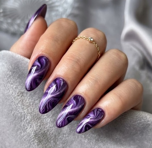 Purple marble cat eye nails combine swirling marble patterns with magnetic shimmer. The result is a luxurious, stone-like appearance with added depth. The cat eye effect highlights the natural flow of the marble design. This creates a sophisticated and artistic manicure. It works beautifully on medium to long nails. A glossy top coat enhances the marble details. This design is ideal for elegant and refined looks. It’s both timeless and trendy.