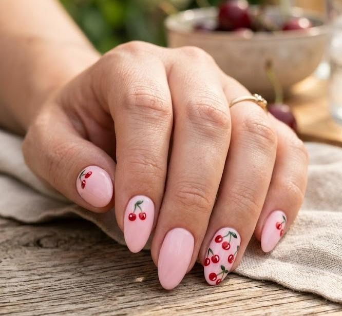 Nothing screams summer like fruity nail art. Tiny cherry designs on a nude or pastel base create a playful and youthful vibe. This look is perfect for vacations, picnics, and beach days.