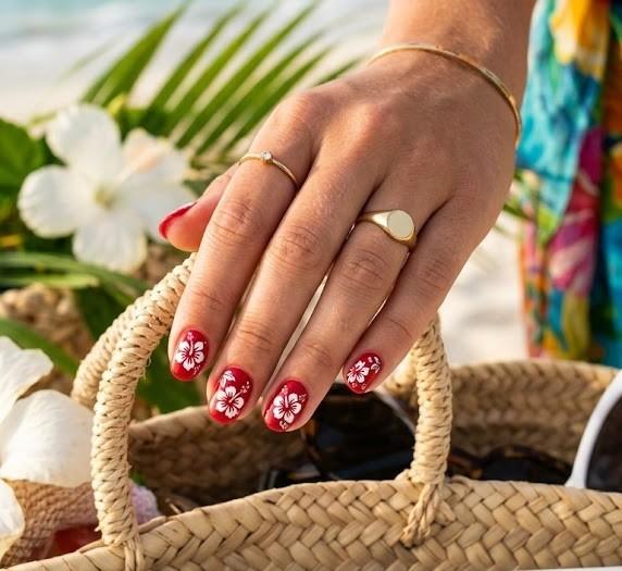Floral patterns on red nails bring a tropical, beach ready vibe. Designs like hibiscus flowers or tiny blossoms add a feminine and cheerful touch.