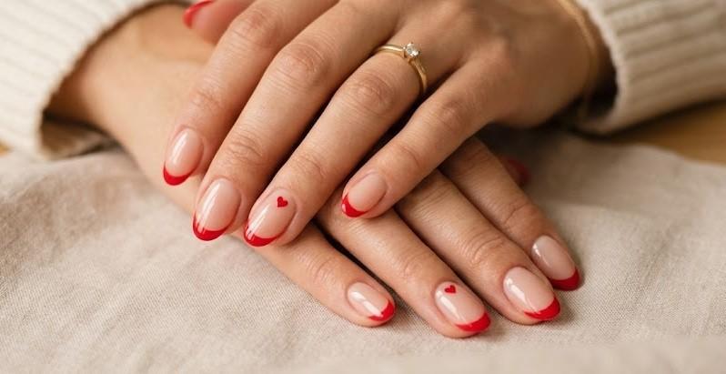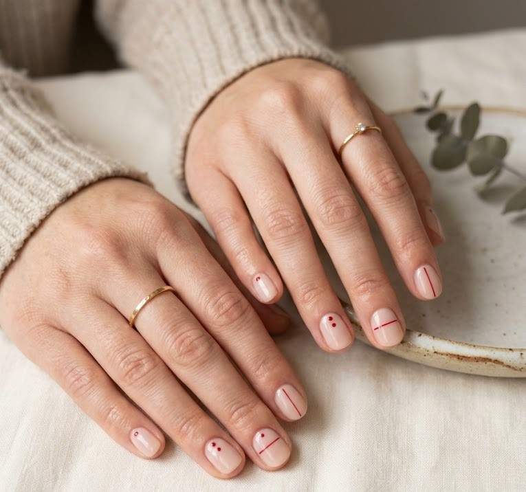 Minimal designs like red dots, lines, or tiny hearts on a nude base create a clean and modern look. It’s perfect for everyday wear while still staying stylish.