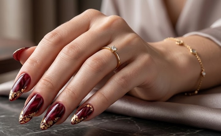 Inspired by natural gemstones, red agate nails feature layered textures, marble effects, and sometimes gold foil. The mix of matte and glossy finishes creates a rich, dimensional look that feels ultra-luxurious.