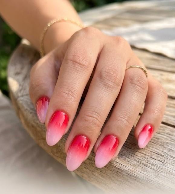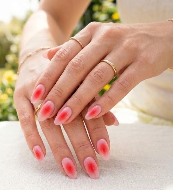 Aura nails feature a soft, glowing red center that fades into a lighter pink or nude edge, creating a dreamy halo effect. This design feels airy and modern while still keeping that bold red energy. It’s one of the most aesthetic summer trends because it blends softness with vibrancy.