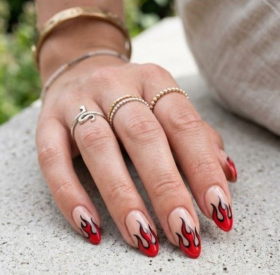 Flame designs bring a bold, edgy vibe to your manicure. Red flames outlined in black or white over a nude base create a striking contrast. Perfect for those who want a “cool girl” summer look with attitude and personality.