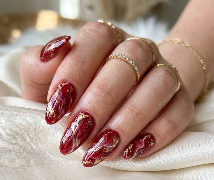 Red marble nails combine swirls of white, black or gold over a red base to create a luxurious stone like effect. This design looks high end and artistic making it perfect for both everyday glam and special occasions.