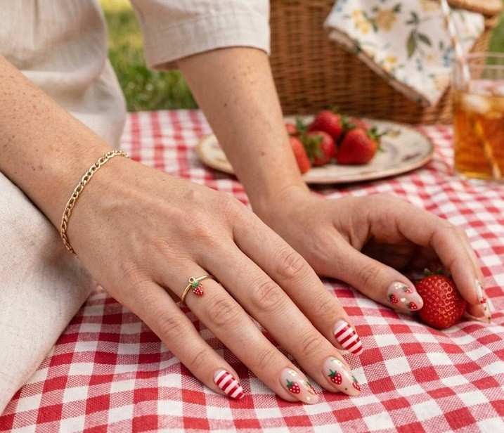 This design mixes red stripes, nude bases, and cute strawberry art for a retro picnic vibe. It’s playful, colorful, and perfect for summer festivals or casual outings.
