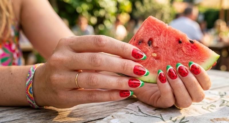 This playful design uses red polish as the watermelon base, with green tips and tiny black seeds for detail. It’s fun, juicy, and perfect for beach days or vacation basically summer in nail form.
