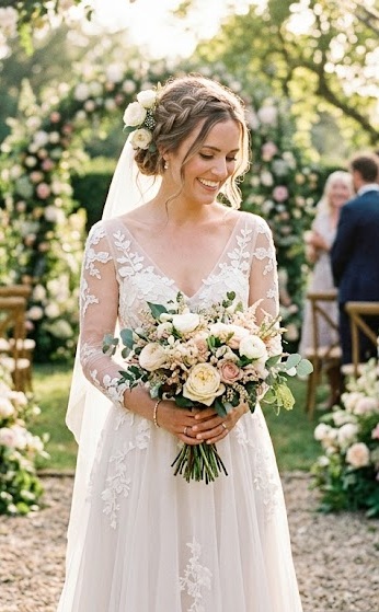 The A-line dress offers a softer, more wearable version of the ball gown. It gently flares from the waist, creating a natural flow that feels effortless and romantic. Often crafted with chiffon or soft satin, these dresses move beautifully with every step. Floral lace details or subtle embroidery enhance the romantic vibe, making it ideal for garden or beach weddings. This silhouette suits almost every body type and gives a graceful, timeless appeal.