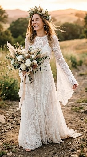 The bohemian wedding dress captures a free-spirited, effortless romance. Designed with flowing fabrics, bell sleeves, and delicate lace or crochet details, this style feels natural and dreamy. It’s ideal for outdoor settings like beaches, forests, or rustic venues. The relaxed silhouette allows for comfort while maintaining a soft, feminine aesthetic. Often paired with loose waves and floral crowns, this dress celebrates individuality and organic beauty.
