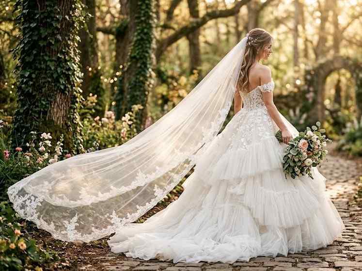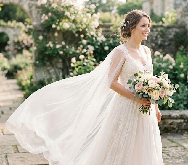 Cape wedding dresses are a stunning alternative to traditional veils. The cape flows from the shoulders, adding drama and movement while maintaining a soft, romantic feel. Whether sheer and lightweight or richly embellished, this style creates a regal and contemporary bridal look.