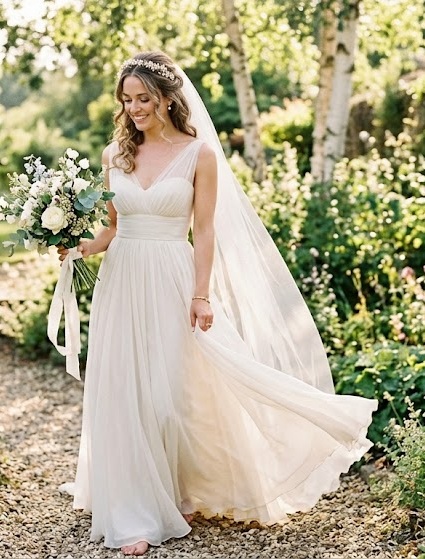 Empire waist dresses bring a soft, ethereal charm with their high waistline just below the bust. The flowing skirt creates a graceful, airy silhouette that feels light and romantic. Often made with chiffon or silk, this design is perfect for warm-weather weddings or brides who prefer comfort without sacrificing elegance.