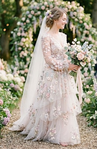 Floral and embellished dresses bring a whimsical, fairytale-inspired romance. 3D floral appliqués, pearl details, and subtle pastel tones add depth and personality. These dresses are perfect for brides who want something unique yet deeply romantic. The delicate detailing creates a dreamy aesthetic, especially for outdoor or spring weddings.