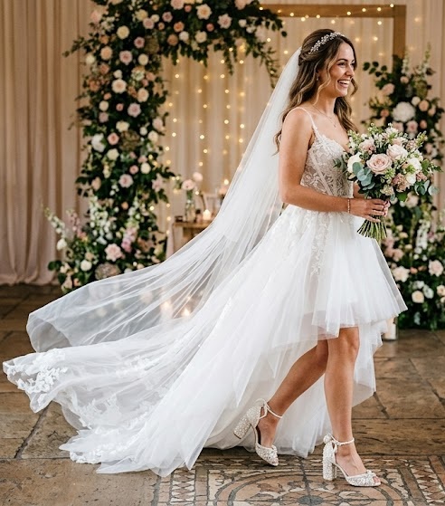 The high low wedding dress blends playful energy with romantic elegance. With a shorter front and longer back, it allows brides to showcase their shoes while still enjoying a dramatic train. This style is perfect for modern brides who want a mix of tradition and fun, especially for outdoor or semi-formal weddings.