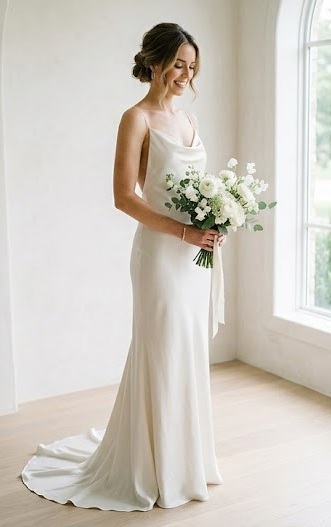 Romance doesn’t always mean heavy details. The minimalist slip dress proves that simplicity can be deeply elegant. With clean lines, silk or satin fabrics, and a body-skimming silhouette, this style feels intimate and modern. Inspired by ’90s fashion, it’s perfect for city hall weddings or intimate ceremonies. The beauty lies in its understated charm and effortless sophistication.