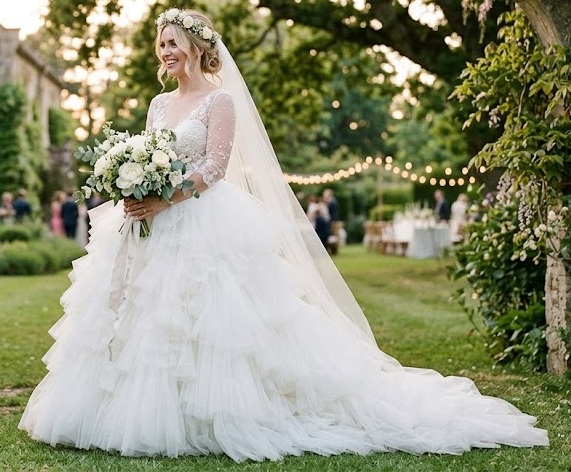 Ruffled dresses bring texture and drama to romantic bridal fashion. Layers of soft tulle or organza create cascading ruffles that add volume and movement. This design feels whimsical and bold, perfect for brides who want a statement look while keeping a soft, dreamy aesthetic.