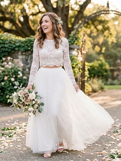 Two-piece wedding dresses are a modern take on romance. Featuring a separate top and skirt, they allow for versatility and personalization. Lace crop tops paired with flowing skirts create a balance between contemporary style and bridal softness. This design is perfect for brides who want something unique and fashion forward.
