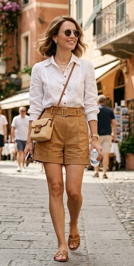 Belted shorts are perfect for creating a defined and structured silhouette. The belt draws attention to the waist, adding elegance and shape to the outfit. Pair them with a tucked-in blouse or shirt for a polished look. Choose neutral or earthy tones for versatility. This outfit works well for both casual and semi-formal summer occasions.
